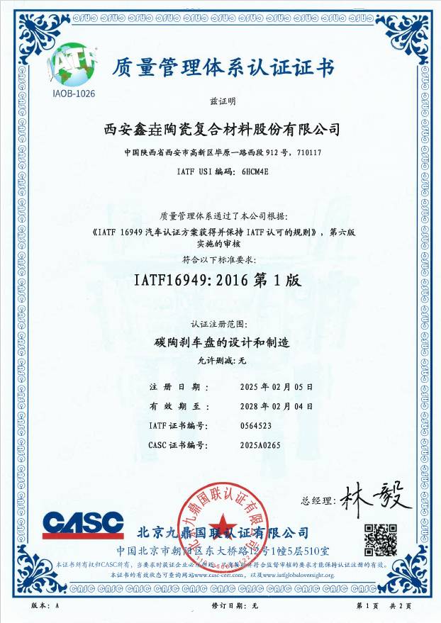 近日,西安鑫垚陶瓷復(fù)合材料股份有限公司收到了北京九鼎國(guó)聯(lián)認(rèn)證有限公司下發(fā)的IATF 16949汽車質(zhì)量管理體系認(rèn)證證書,認(rèn)證注冊(cè)范圍為“碳陶...